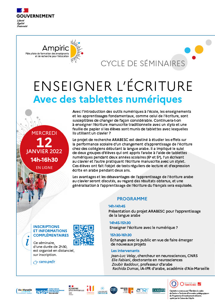 la performance scolaire d’un changement d’apprentissage de l’écriture chez des collégiens débutant la langue arabe. Il a impliqué le suivi de deux groupes d’élèves qui ont appris l’arabe à l’aide de tablettes numériques pendant deux années scolaires (6e et 5e), l’un écrivant au clavier et l’autre pratiquant l’écriture manuscrite avec un stylet. Ces élèves ont fait l’objet de tests réguliers de lecture et d’expression écrite en arabe pendant deux ans.