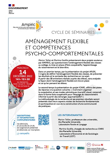 Marion Tellier et Martine Gadille présenteront deux projets soutenus par AMPIRIC, qui questionnent l’aménagement flexible des classes au collège, la mise en place d’îlots coopératifs, l’apprentissage du raisonnement et le bien-être.