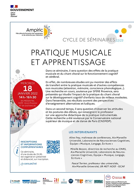 En effet, de nombreuses études ont pu montrer des effets de transfert entre la pratique musicale et d’autres compétences non musicales (attention, mémoire, conscience phonologique…). Une recherche en cours, soutenue par SFERE Provence, sera présentée qui étudie l’impact de la pratique du chant choral sur le développement cognitif d’enfants issus de milieux modestes. Dans l’ensemble, ces résultats ouvrent des perspectives d’enseignement alternatives et ludiques.