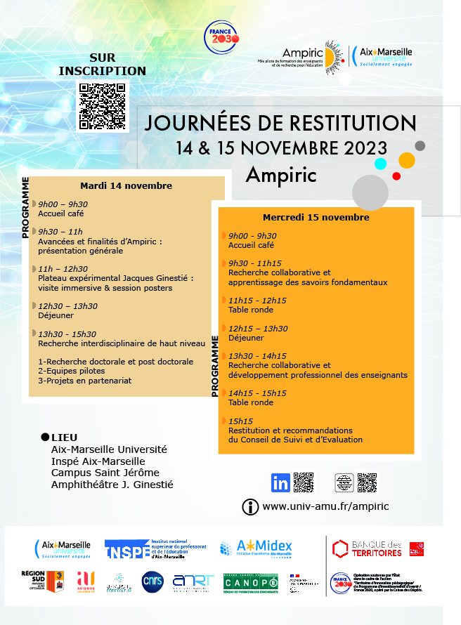 Pour marquer les trois ans des activités du pôle, Ampiric a organisé deux journées de restitution les 14 et 15 novembre à l'Inspé Aix-Marseille. Ces journées ont été l’occasion de présenter le niveau de déploiement du pôle, ainsi que des exemples de projets représentatifs des différents types de recherche dans lesquels Ampiric est engagé.