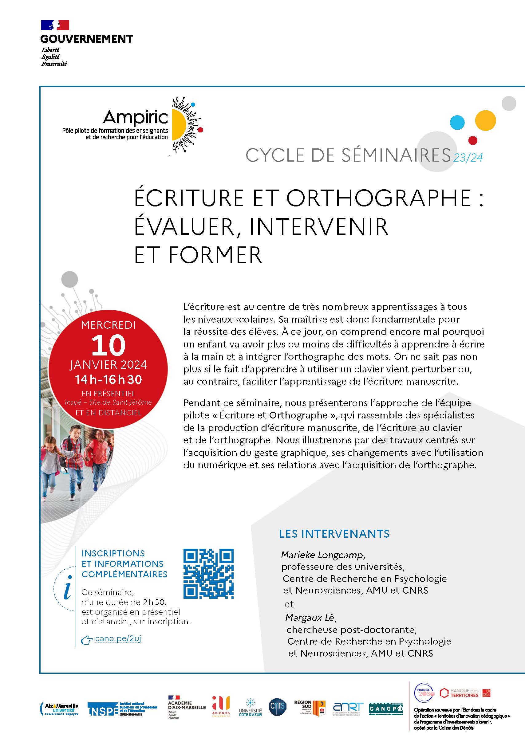 Avec l'équipe pilote Écriture et orthographe Séminaire Cycle de séminaires 2023-2024 Mercredi 10 janvier 2024 de 14h00 à 16h30 Action 5Ecriture et orthographe Hybride Inspé Site Marseille Intervention Marieke Longcamp, AMU - CRPN Animation Léo Merle, Canopé Sur inscription ici formation écriture