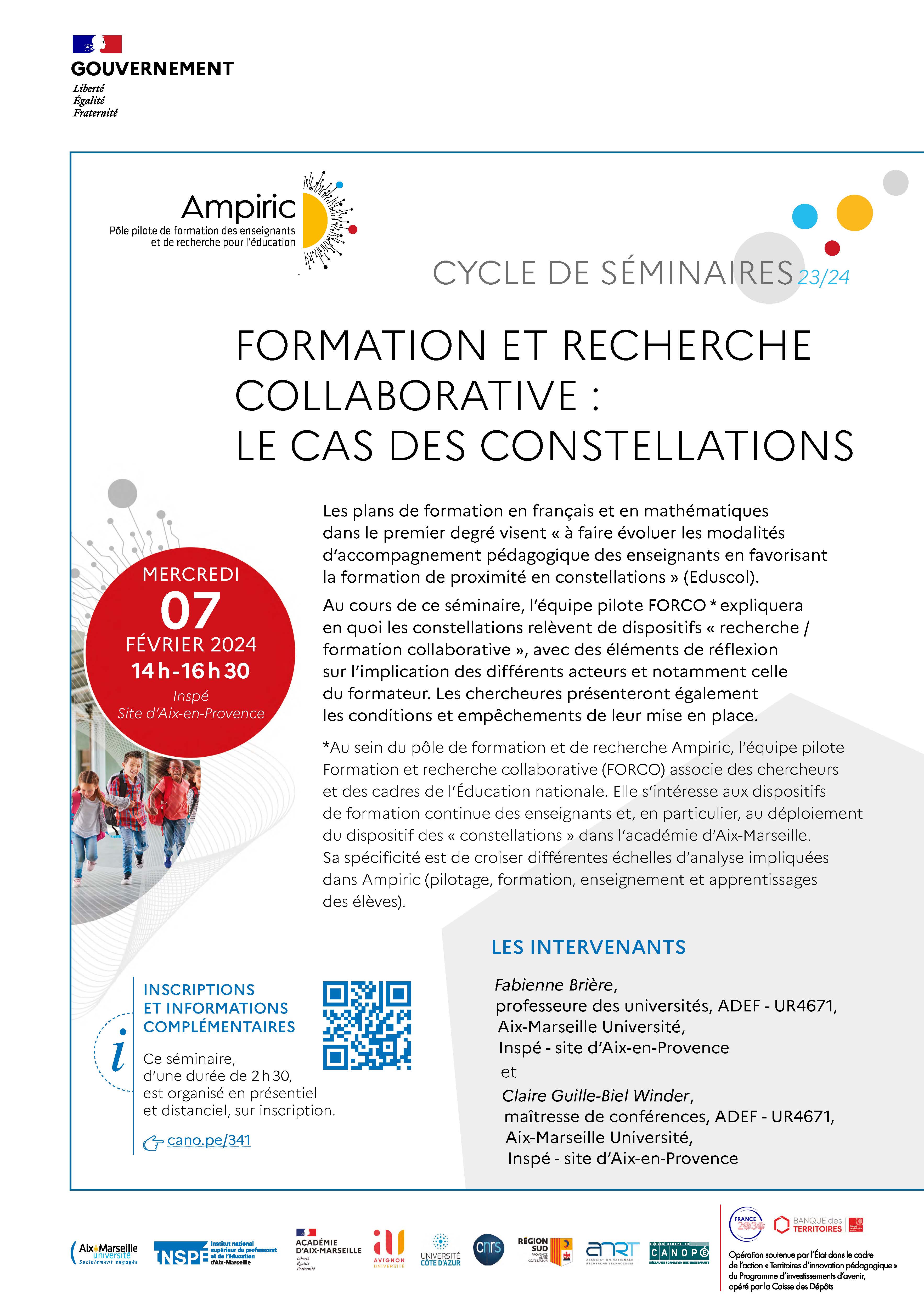 Au cours de ce séminaire, l’équipe pilote FORCO* expliquera en quoi les constellations relèvent de dispositifs « recherche / formation collaborative », avec des éléments de réflexion sur l’implication des différents acteurs et notamment celle du formateur. Les chercheures présenteront également les conditions et empêchements de leur mise en place.