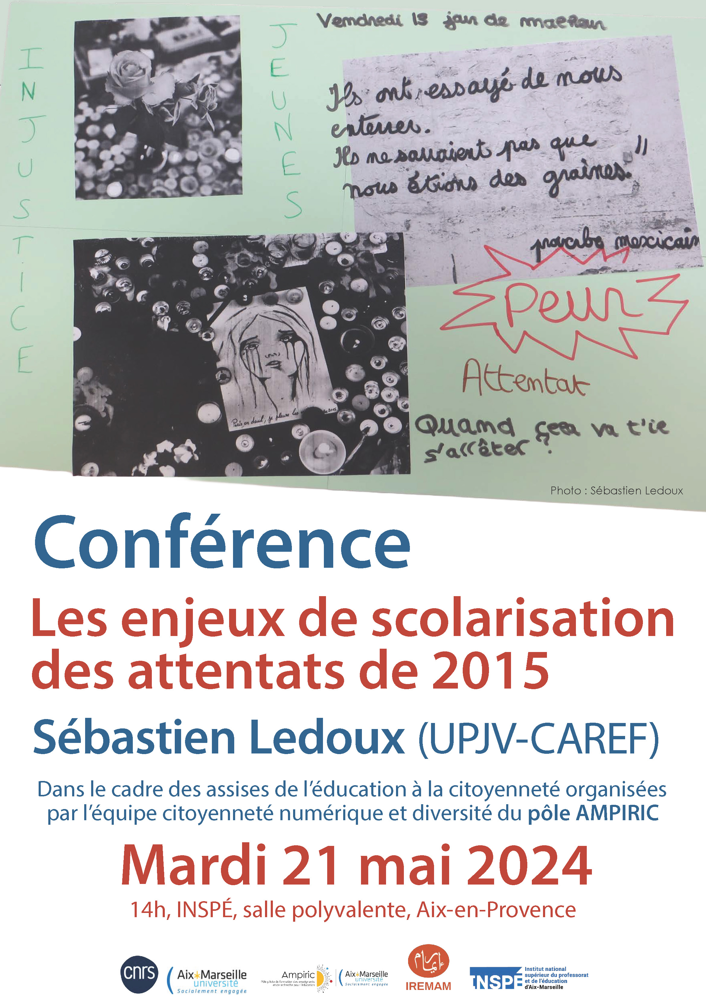 Conférence de Sébastien Ledoux (UPJV-CAREF) intitulée « Les enjeux de scolarisation des attentats de 2015 », mardi 21 mai 2024, à 14h, salle polyvalente de l’INSPÉ à Aix-en-Provence.