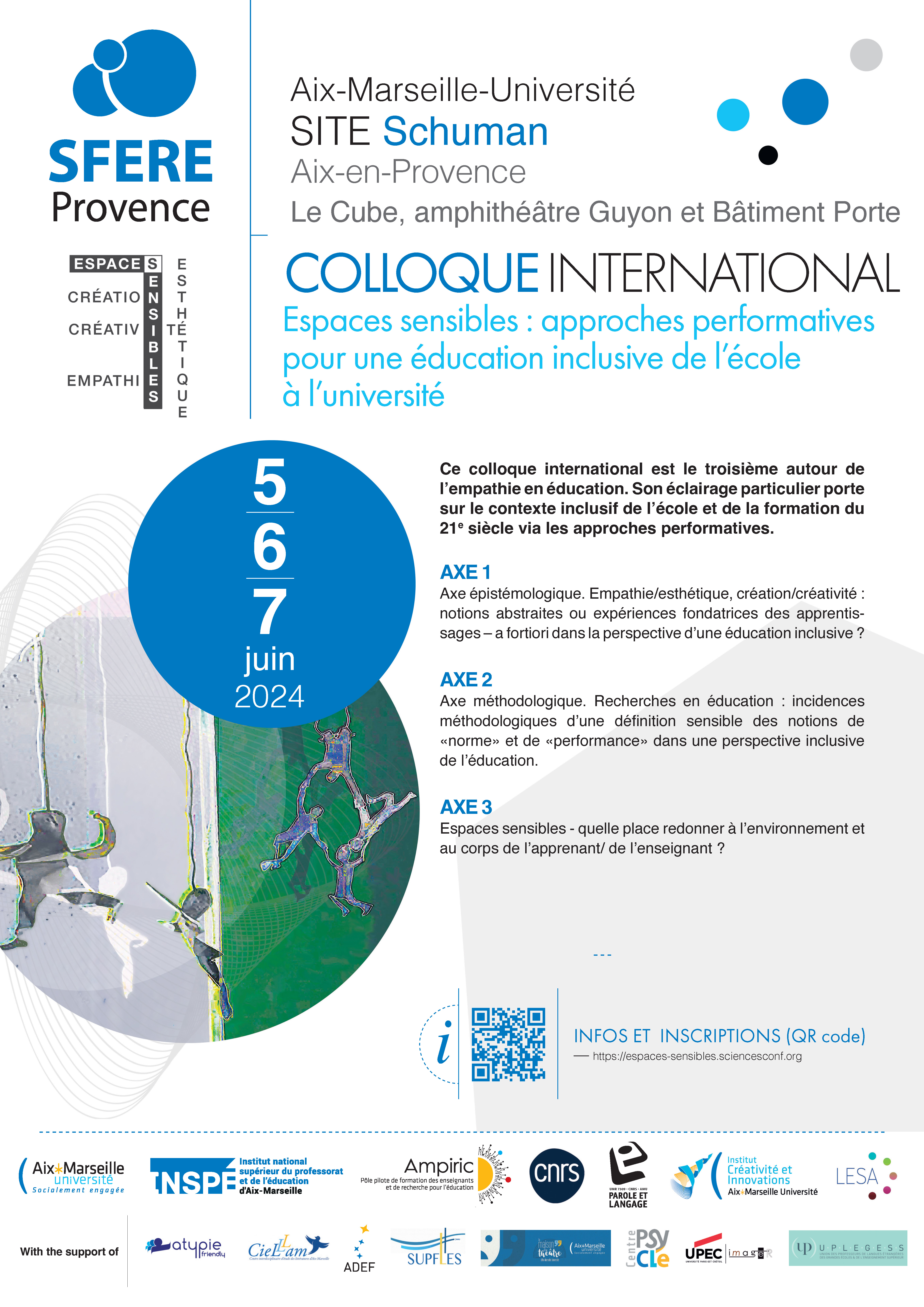 Avec le projet Éducation 2030 (OCDE, 2018), la créativité et la capacité à interagir collectivement, à s’adapter, à transformer le monde et notre vision du monde – capacité impliquant l’empathie – sont alors posées comme des incontournables. Dans ce contexte, les concepts d’empathie, de créativité et/ou de création, qui côtoient régulièrement ceux d’esthétique et de performance, (re)trouvent progressivement leur place dans le champ de l’éducation. La place du corps de l'apprenant et celle de l'enseignant sont réinterrogées, dès lors que le sensible et les espaces d'apprenance se trouvent reconsidérés. Mais ces notions restent parfois considérées comme floues car elles sont intimement liées au mouvement de la vie et à la subjectivité voire à l’intime. Dans ce colloque, il s’agira de retracer leur épistémologie et de comprendre leur rôle central pour le développement de l’éducation inclusive. Nous interrogerons quelles places elles peuvent — ou devraient tenir — dans les compétences et les savoirs dits « fondamentaux » de l’école ou de l’université, et quelles incidences cela peut avoir sur les modèles et contenus de la formation des enseignants.