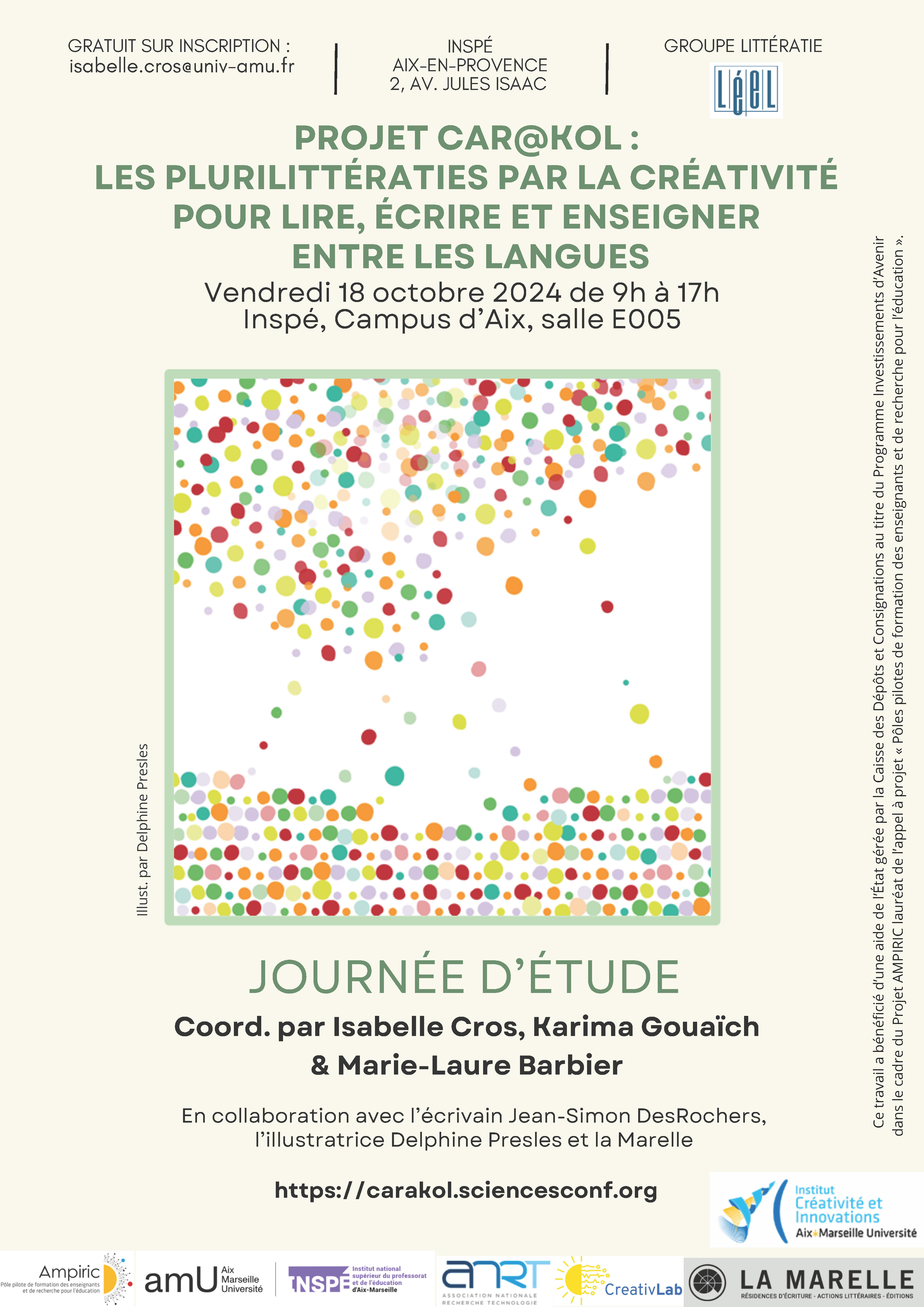 - 9h15-9h45 — Le projet Car@kol, de l’analyse d’albums plurilingues à la co-écriture et l’expérimentation d’un album de jeunesse, par I. Cros (LPL, AMU), K. Gouaïch (ADEF, AMU) et M.-N. Roubaud (LPL, AMU)