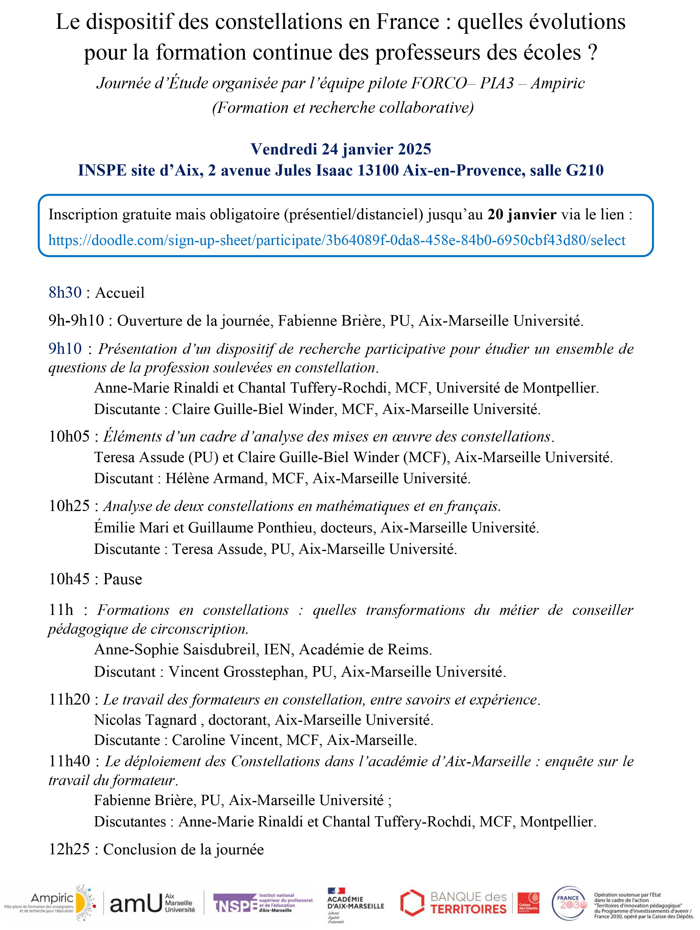 L'équipe pilote FORCO ((Formation et recherche collaborative) - Ampiric organise une Journée d’Étude sur le thème "Le dispositif des constellations en France : quelles évolutions pour la formation continue des professeurs des écoles ?" le Vendredi 24 janvier 2025 de 8h30 à 12h30 à INSPE site d’Aix, 2 avenue Jules Isaac 13100 Aix-en-Provence, salle G210