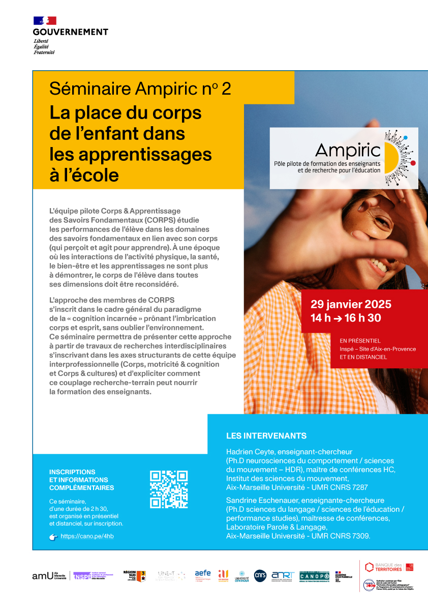 L’approche des membres de CORPS s’inscrit dans le cadre général du paradigme de la « cognition incarnée » prônant l’imbrication corps et esprit, sans oublier l’environnement. Ce séminaire permettra de présenter cette approche à partir de travaux de recherches interdisciplinaires s’inscrivant dans les axes structurants de cette équipe interprofessionnelle (Corps, motricité & cognition et Corps & cultures) et d’expliciter comment ce couplage recherche-terrain peut nourrir la formation des enseignants.