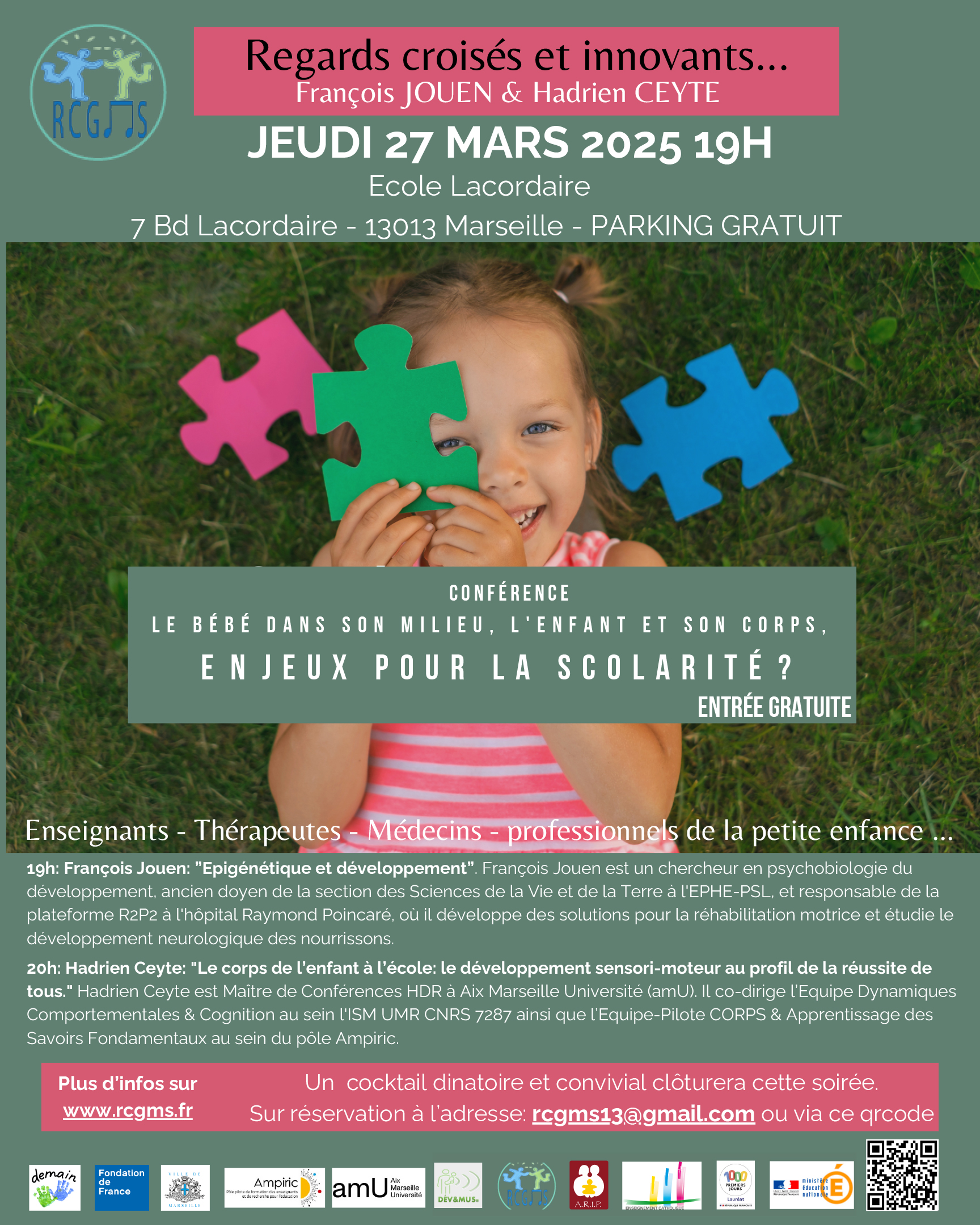 L'association RCGMS "Remédiation cognitive par le Geste Musical Spécifique"* organise dans le cadre des "Regards croisés et innovants", une conférence "Le bébé dans son milieu, l'enfant et son corps, enjeux pour la scolarité ?"